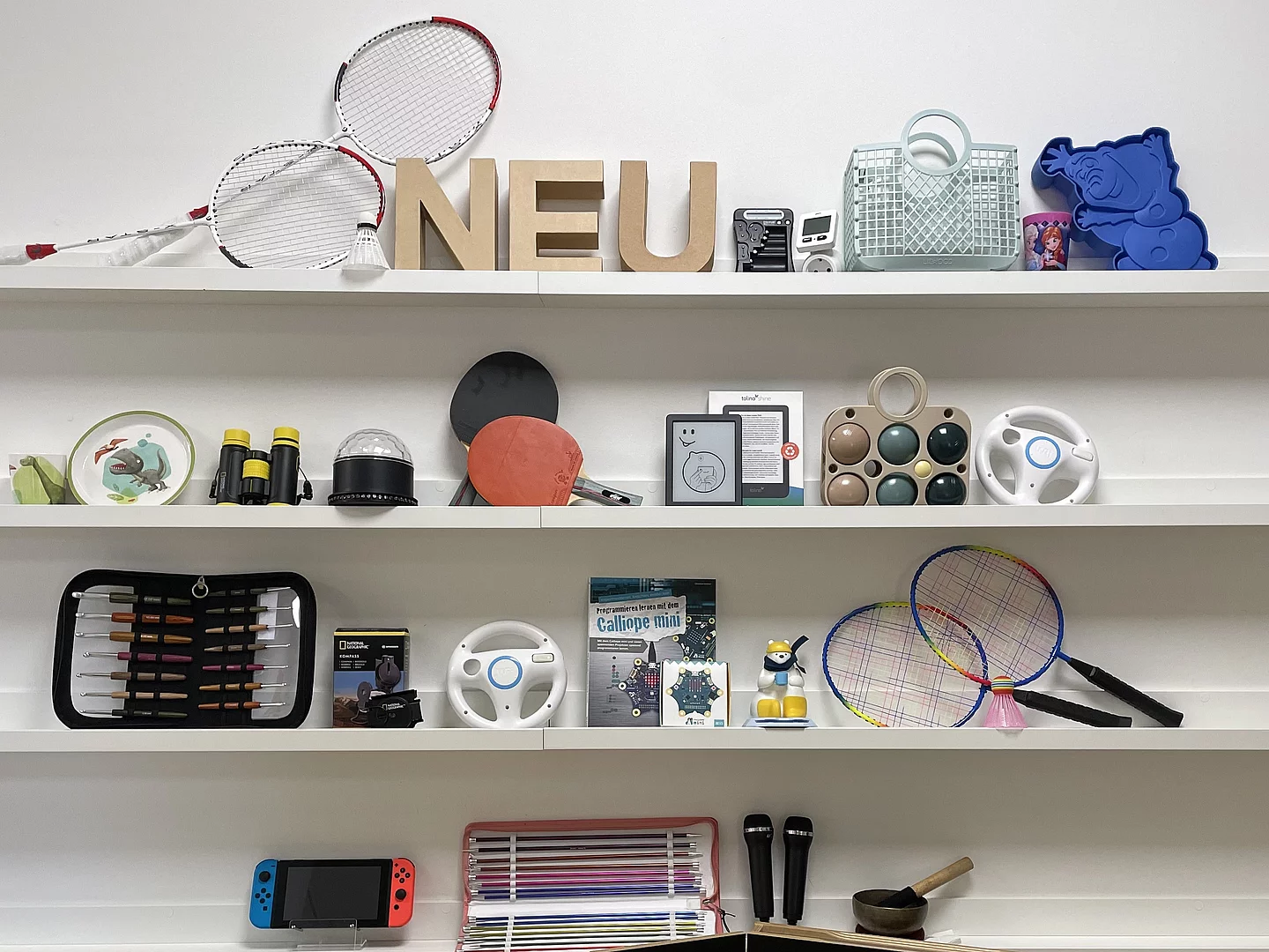 Entdecken Sie die Stadtbücherei einmal anders – mit tollen Dingen zum Ausleihen. In unserer Bibliothek der Dinge finden Sie alles rund um Freizeit, Spiel und Spaß: Von Boulekugeln über Federballschläger bis hin zu Stricknadeln für kreative Projekte. Planen Sie eine Feier? Dann stöbern Sie in unseren Partyangeboten: von Discolicht über Popcornmaschine bis hin zu Mottokisten für Kindergeburtstage – damit peppen Sie jede Feier auf. Auch für Technik- und Entdeckungsfreunde haben wir spannende Dinge: Erkunden Sie die Welt mit Kompass und Fernglas, lernen Sie Programmieren mit dem Calliope oder testen Sie unsere Spielekonsolen, den Sami Lesebären oder den Tiptoi Stift. Probieren Sie auch unsere Tolino eReader aus und entdecken Sie die Welt der digitalen Bücher in unserer Onleihe. Schauen Sie vorbei und entdecken Sie, was unsere Bibliothek der Dinge bereithält – Ausprobieren ausdrücklich erwünscht.